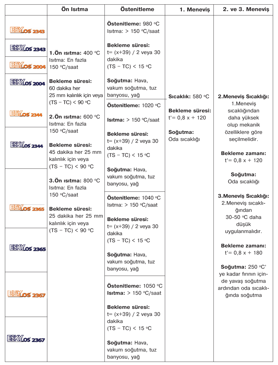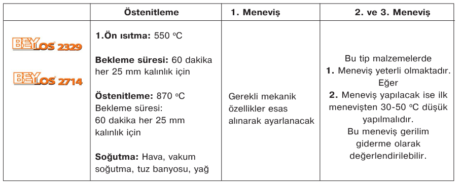 Kullanmaya başlamadan önce, BeyLos® ailesine ait tüm çeliklere ısıl işlem uygulanacak, (Yumuşak tavlı olduğu gibi 40-44 HRC sertlikte teslim edilen BeyLos® 2714 hariç) östenitleme işleminin ardından en az iki meneviş yapılmalıdır. Üçüncü menevişi, gerilim giderici işlem olarak tavsiye etmekteyiz.