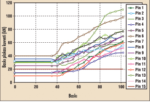 Tüm tampon pinlerinde aynı baskı plakası kuvvetinin olduğu ancak baskı presi esnasında değiştiği durum,
