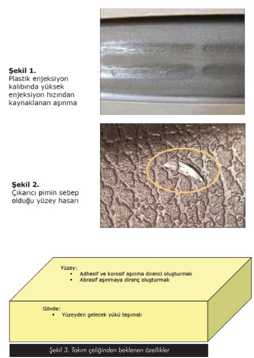 Adhesif aşınma ise metal saclara form veren kalıplarda meydana gelmektedir. Bununla birlikte, aşınma kalıp yüzeylerinde meydana gelen mekanik hasara bağlı olarak da gelişmektedir.Çıkarıcı pimin kalıp yüzeyinde meydana getirdiği hasar şekil 2’de gösterilmiştir. Kalıp imalatında kullanılan takım çeliklerinin çok önemli iki fonksiyonu vardır; bunlardan ilki üretim esnasında kalıba uygulanan yüklere karşı direnci oluşturmaktır. Bu esnada kalıp çeliğinin gövdesi plastik deformasyon olmaksızın bu yüklere karşı koymalıdır. İkincisi ise kalıp yüzeyidir. Kalıp yüzeyi üretilen malzemenin yaratacağı olumsuzluklara ve servis koşullarına karşı koyacak derecede uygun özelliklere sahip olmalıdır.