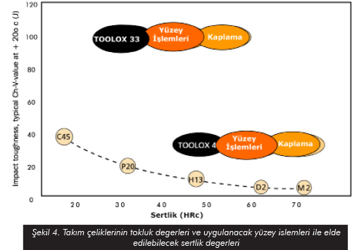 Konvansiyonel takım çeliklerinin ve TOOLOX’un tipik darbe toklukları yine şekil 4’de gösterilmiştir. Aynı sertlik degerinde TOOLOX’un darbe tokluğu konvansiyonel çeliklerden daha yüksektir. TOOLOX’un geliştirilmiş darbe tokluğu değerleri aynı sertlikte ama düşük darbe tokluğuna sahip konvansiyonel takım çeliklerine göre avantaj yaratmaktadır. Bu avantaj, çatlaklar kalıp yüzeyine ulaştığında durdurulacağı ve daha büyük hasarların çatlamaya engel olması şeklinde değerlendirilebilir.