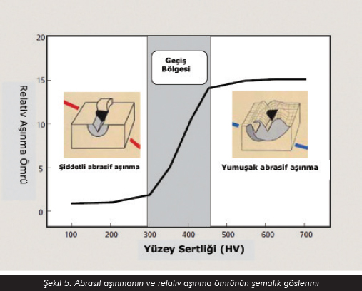 Kesme modu en şiddetli şekilde meydana gelen ve abrasif ortamın yada partikülün kalıp yüzeyinden çok sert olması durumunda oluşmaktadır (yüksek Habrasif/Hyüzey değeri). Yumuşak aşınma modu, çizme modu, kalıp yüzey sertliğinin görece abrasif partikülden sert olduğu durumda meydana gelmektedir ( düşükHabrasif/yüzey değeri). Aşınma modları genellikle relativ sertlik değerleri 1.6 olduğunda oluşmaktadır (Habrasif/Hyüzey=1.6). Burada elbette ki bir geçiş aralığı vardır ve aşınma modları arasındaki geçiş sekil 5’te gösterilmiştir. Çok açık ki, relativ sertlik değerlerindeki küçük değişiklikler beklenen aşınma ömründe önemli değişikliklere yol açacağı için geçiş aralıklarında aşınma sisteminden kaçınmak önemlidir. Buradaki hedef mümkün olduğu kadar stabil yumuşak aşınma bölgesinde kalmaktır.
