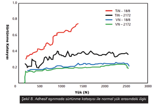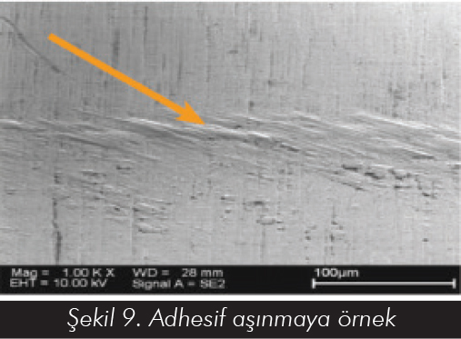 Adhesif aşınmayı kontrol altında tutacak en önemli parametre sürtünmedir. Adhesif sistemdeki yüksek sürtünme daha yüksek yüklerin uygulanmasına neden olacaktır. Bu yüksek yük, sisteme yüksek enerji yükleyecek ve buda sıvanma riskini artıracaktır (Şekil 8) Adhesif aşınmaya maruz kalmış bir kalıp yüzeyi şekil 9’da gösterilmiştir.