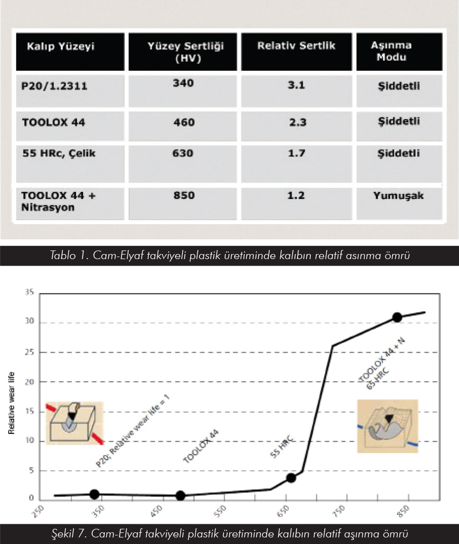 Cam-elyaf(Silica’ninSertliği: 1060HV), naylon çok düşük sertliğe sahip olduğundan kalıbın servis ömrünü belirleyen etkendir. Tablo 1’de değişik takım çeliklerinin, değişik kaplamaların sertlikleri, relativ sertlik değerleri ile verilmektedir: Hsilika/Hyüzey=1060/HVyüzey