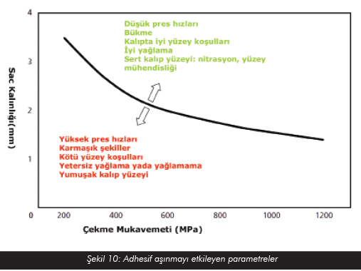 Şekil 10’da gösterilen diyagram ile form verme operasyonlarında yüzey işlemlerinin ne zaman uygulanacağı genel bir bilgi olarak tanımlanmıştır. Şekil 10’da yeşil harflerle yazılanlar adhesif aşınmayı minimize ederken kırmızı ile yazılanlar negatif bir etki yaratmaktadır. Mavi çizginin şekli ve pozisyonu ise gerçek adhesf aşınma sistemi tarafından belirlenmektedir. Eğer, yeşil harfle belirtilenlere bağlı olarak adım atılırsa eğri yukarı doğru hareket edecektir. Eğrinin altındaki alan malzeme kalınlığına ve mukavemetine bağlı olarak yüzey işlemlerinin uygulanamayacağı durumları göstermektedir. Ayrıca çelik matriks’nin uygulanan katmaları taşıyacak kadar mukavemetli olmasına da özen gösterilmelidir.