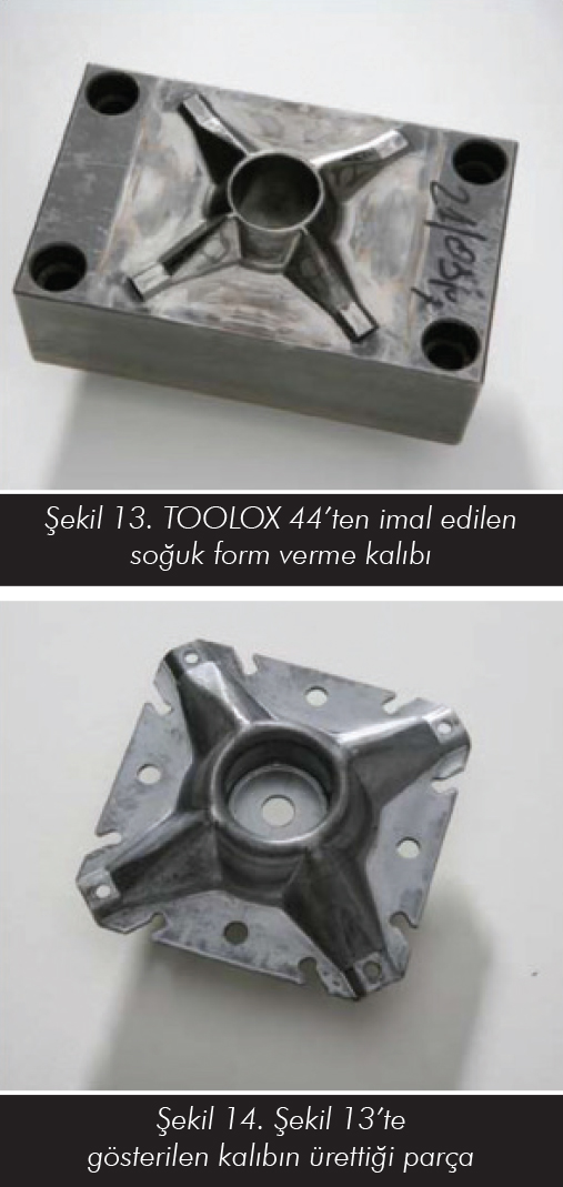 Bir önceki kalıp malzemesi ile karşılaştırıldığın da TOOLOX 44 daha düşük bir sertlik seviyesine sahip. Kalıp TOOLOX 44 kullanılarak bir hafta sonun da imal edildi ve kırılma problemi olmaksızın 65000 adet üretim yaptı ve çalışmaya devam ediyor.(Şekil 14).