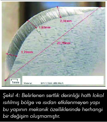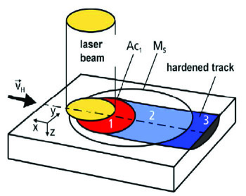 Boyutu tanımlanan lazer ışık huzmesi parçaya odaklanmakta ve belirlenen hat boyunca oluşmaktadır. Lazer ışık huzmesinin odaklanması ve bu ışının tanımlanan belli bir hat boyunca ilerlemesi sonucunda ısıdan etkilenmiş lokal bir bölge oluşur. (Şekil 4) Isıdan etkilenmiş bu lokal bölgenin çevresindeki bölgeler lazer sertleştirme prosesinden etkilenmeyecektir. Bu proses teknik parçalarda benzersiz avantajlar ve olanaklar sağlamaktadır. Yeniden işleme ve ekstra temizlik gibi proseslere gerek kalmayacaktır. Isıl işlem yapılan alan boyunca hassas ve fonksiyonel yüksek sertlikler oluşacaktır.