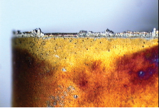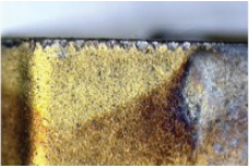 5.Termal aşınma, sıcaklıklardaki hızlı dalgalanmaların ve mekanik darbelerin bir sonucu olarak ortaya çıkar. Uç kenarındaki stres çatlakları zamanla uç kenarının çeşitli bölümlerinin dışarı çekilerek ufalanmasına neden olur. Termal aşınmanın bir belirtisi, kesici kenara dik birden fazla çatlak oluşmasıdır. Bu bozulma türünü ufalanma başlamadan önce tespit etmek önemlidir. Termal aşınmayı önlemek için soğutma sıvısını doğru şekilde uygulayın ya da daha iyisi, darbelere karşı daha dayanıklı bir uç kalitesi ve ısıyı azaltan bir geometri kullanın.