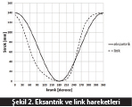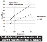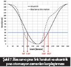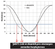 Eksantrik ve link preslerin iş yapma ve otomasyon zamanlarının krank derecesi cinsinden karşılaştırılması Şekil 5’de gösterilmiştir. Grafikte tam karşılaştırma yapabilmek için, link hareketinin alt ölüsü kaydırılarak, eksantrikle çakıştırılmıştır. Karşılaştırma aşağıdaki pres özelliklerine göre yapılmıştır;
