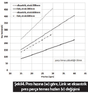 Şekil 4’de belli bir parça yüksekliğinde, değişik stroklarda, değişik pres hızlarına (w) göre link ve eksantrik pres için parça temas hızları (v) değişimi gösterilmiştir. Buna göre, uzun stroklarda