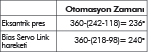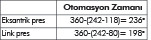 Şekil 5’e göre eksantrik pres için; koçun parçaya temas ettiği krank derecesi 118° dir. Koç 118° ile 180° aralığında parçayı şekillendirmektedir. Koç 180°, yani alt ölü bölgeye ulaştığında iş yapması bitmiştir ancak otomasyonun başlayabilmesi için koçun parça ile temasının kesilmesi gerekmektedir. Krank derecesi 242° ulaştığında kalıp parça yüksekliğinin üstüne çıkmış olur ve bu durumda otomasyon başlayabilir. Aynı durum link pres için de geçerli olup, parçaya teması 80°’de ve parçadan temasın kesilmesi 242°’de gerçekleşmektedir. Buna göre her iki pres için otomasyon zamanları aşağıdaki gibidir.
