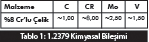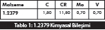 Soğuk iş kalıpları denilince akla gelen ilk malzeme tüm dünyada olduğu gibi ülkemizde de 1.2379’dur. Bu malzeme temelde aşınma direnci yüksek olan bir malzemedir. Bu malzemenin kimyasal bileşimi tablo 1’de gösterilmiştir.