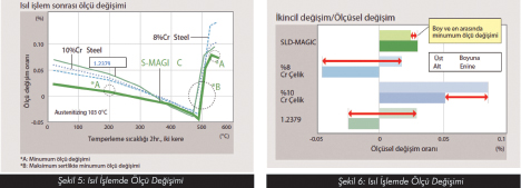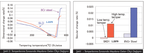 %8Cr’lu çeliklerin diğer bir problemi de ısıl işlem esnasında meydana gelen ölçü değişimlerinin 1.2379 kalite malzemeye nazaran daha fazla olmasıdır. Isıl işlem davranışları ve özellikle temperlenme esnasına meydana gelen ölçü değişimlerini daha iyi anlayabilmek için şekil 2 ve şekil 3 incelenebilir.