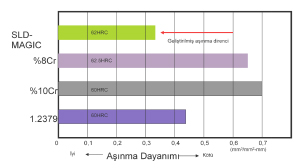 Adhesiv aşınma, görece yumuşak iş parçasının takımın yüzeyine yapışarak, ondan parça koparmasıolaraktanımlanabilir. SLD MAGIC, 1.2379 ve %8Cr’lu çeliklere göre daha iyi bir adhesiv aşınma direnci vermektedir. 9’da gösterilen çalışma incelendiğinde bu soSLD MAGIC bu özelliğinden dolayı özellikle paslanmaz çeliklerin kesme ve form verme kalıplarında, bu problemi çözerek kalıp performanslarını artırmaktadır.