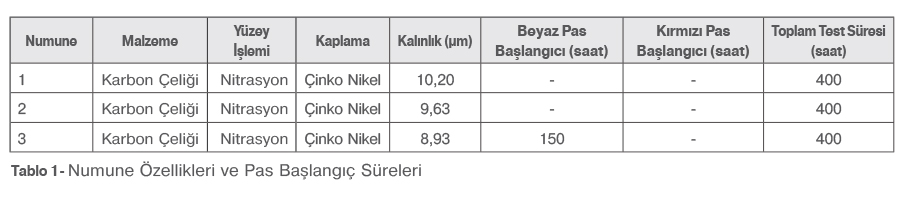 Numune 1: Birinci numune karbon çeliğinden üretilmiş olup nitrasyon işlemi uygulanmıştır. Kaplama kalınlığı 10,20µm olarak ölçülmüştür. Test süresi boyunca kırmızı pas gözlemlenmemiştir. Kaplama kalınlığı, 400 saat boyunca korozyon başlangıcını engellemiş ve tabakanın performansının yeterli olduğunu göstermiştir.