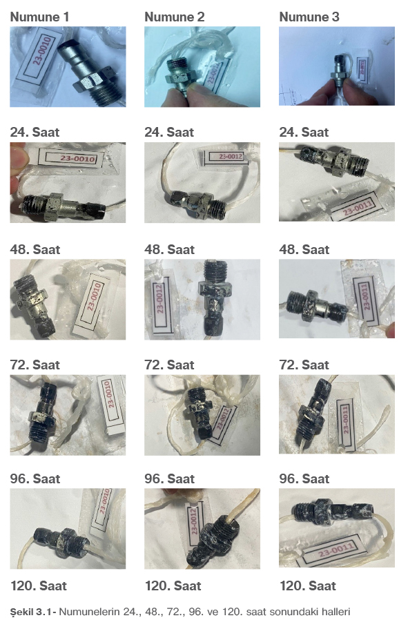 Standartlara uygun olarak aynı malzeme ve aynı kaplama türü seçilen RTC markasına ait 201.06PMF13-SW18-ST ürüne tuz testi uygulanmıştır. Deneyde 3 aynı numune kullanılmıştır. Her bir numune aynı malzeme, aynı kaplamaya ve aynı nitrasyon işlemeye sahip olmakta lakin bağımsız değişken olarak kaplama kalınlığı seçilmiş, farklı kaplama kalınlıkları kullanılmıştır. Her bir seçilen test görmemiş ürün önce 24 saat teste tabi tutulmuş ve daha sonra test süresi arttırılarak numuneler hazırlanmıştır. Ürünlere ait tuz testi öncesi ve sonrası görüntüler çalışmaya eklenmiştir.